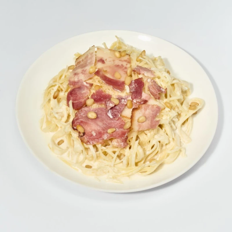 Состав: лапша (мука пшеничная высшего сорта, соль поваренная пищевая, вода питьевая доочищенная), вода питьевая доочи-щенная, масло подсолнечное рафинированное, соль поваренная пищевая, перец черный молотый, сыр плавленый 60 % (сыр, вода питьевая, масло сливочное, сухое обезжиренное молоко, творог, сливки, эмульгаторы, загустители, регулятор кислотности - лимонная кислота), сливки 33 % (сливки нормализованные), бекон с/к (грудинка свиная (кат.А), вода доочищенная питьевая, соль поваренная пищевая, декстроза), ядра кедрового ореха, сыр Пармезан 40% (молоко нормализованное пастеризованное, соль поваренная пищевая, бактериальная закваска мезофильных молочнокислых микроорганизмов, молокосвертывающий ферментный препарат микробного происхождения, уплотнитель хлорид кальция, краситель аннато).