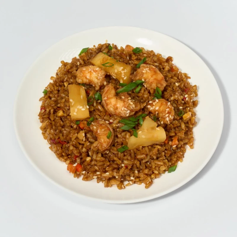 КУЛИНАРНОЕ ИЗДЕЛИЕ С МОРЕПРОДУКТАМИ ЖАРЕНОЕ ОХЛАЖДЕННОЕ. ЖАРЕНЫЙ РИС С КРЕВЕТКАМИ И АНАНАСОМ ПО-ТАЙСКИ. Состав: Рис шлифованный первый сорт, креветки Ваннамей замороженные, перец болгарский свежий, морковь свежая, лук репчатый свежий, лук зеленый свежий, меланж яичный жидкий пастеризованный охлажденный, соус соевый (вода, соевые бобы, пшеница, соль, сахар, консервант сорбат клия), масло кунжутное (100% кунжутное масло первого горячего отжима темное нерафинированное (получено путем прессования)), чеснок свежий, имбирь корень свежий, ананас консервированный (ананас, вода, сахар), соус соевый (вода, соевые бобы, пшеница, соль, сахар, консервант сорбат клия), соус рыбный (вода, соль, сахар, концентрат рыбного соуса (рыба, соль, вода), уксус, регулятор кислотности лимонная кислота, натуральный ароматизатор лимон, консервант сорбат калия, стабилизатор ксантановая камедь), соус устричный (сахар, соль, крахмал кукурузный, устричный экстракт (устрицы, вода, соль) уксус спиртовой, соус соевый (вода питьевая, соя, пшеница, соль), краситель сахарный, усилители вкуса и аромата (гуанилат натрия двузамещенный, инозинат натрия двузамещенный)), паста карри красная (красный перец чили сушеный 21 %, чеснок, лемонграсс, лук-шалот, соль, галангал, каффир-лайм, тмин, кориандр), семена кунжута, масло подсолнечное (высший сорт) (100% подсолнечное масло рафинированное дезодорировнное вымороженное), сахар свекловичный, поваренная соль, крахмал картофельный, перец черный молотый, комплексная пищевая добавка: ацетаты натрия, цитраты натрия. Продукция может содержать следующие аллергены и продукты их переработки: арахис, горчица, диоксид серы и сульфиты, злаки, содержащие глютен, кунжут, люпин, моллюски, молоко (в том числе лактоза), орехи, ракообразные, рыба, сельдерей, соя, яйца.