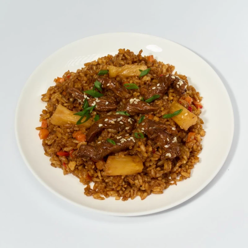 КУЛИНАРНОЕ ИЗДЕЛИЕ С МЯСОМ ЖАРЕННОЕ ОХЛАЖДЕННОЕ. ЖАРЕНЫЙ РИС СО СВИНИНОЙ И АНАНАСОМ ПО-ТАЙСКИ. Состав: Рис шлифованный первый сорт, свинина вырезка (категории А), перец болгарский свежий, морковь свежая, лук репчатый свежий, лук зеленый свежий, меланж яичный жидкий пастеризованный охлажденный, соус соевый (вода, соевые бобы, пшеница, соль, сахар, консервант сорбат клия), масло кунжутное (100% кунжутное масло первого горячего отжима темное нерафинированное (получено путем прессования)), чеснок свежий, имбирь корень свежий, ананас консервированный (ананас, вода, сахар), соус соевый (вода, соевые бобы, пшеница, соль, сахар, консервант сорбат клия), соус рыбный (вода, соль, сахар, концентрат рыбного соуса (рыба, соль, вода), уксус, регулятор кислотности лимонная кислота, натуральный ароматизатор лимон, консервант сорбат калия, стабилизатор ксантановая камедь), соус устричный (сахар, соль, крахмал кукурузный, устричный экстракт (устрицы, вода, соль) уксус спиртовой, соус соевый (вода питьевая, соя, пшеница, соль), краситель сахарный, усилители вкуса и аромата (гуанилат натрия двузамещенный, инозинат натрия двузамещенный)), паста карри красная, семена кунжута, орех кешью, масло подсолнечное (высший сорт) (100% подсолнечное масло рафинированное дезодорировнное вымороженное), сахар свекловичный, поваренная соль, крахмал картофельный, перец черный молотый, пищевая добавка сорбат калия.